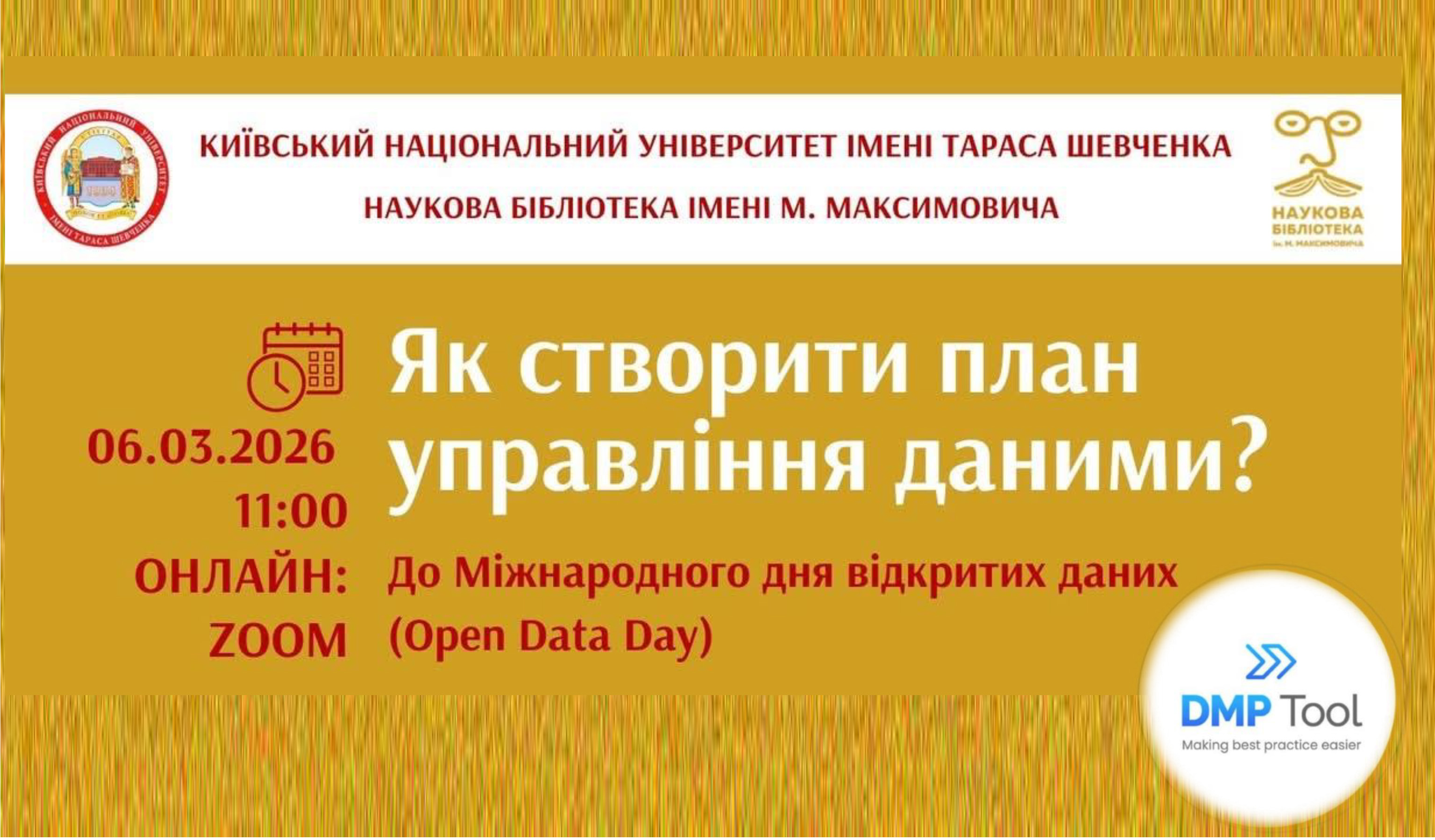 Наукова бібліотека імені М. Максимовича запрошує аспірантів (ад’юнктів) та докторантів 06.03.2026 на вебінар, присвячений Міжнародному дню відкритих даних. Учасники дізнаються, як покроково заповнити план управління даними (DMP) у сервісі DMPtool. |